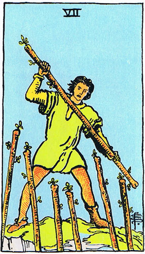 Je verzetten tegen anderen en andere impulsen is normaal. Staven zeven geeft dit weer; een staf tegen zes andere staven. Een actieve energie tegen zes andere en verschillende energieen. Je hoeft niet altijd overal in mee te gaan. Altijd ja te knikken terwijl je nee bedoelt. Je bent in het voordeel! Wees eerlijk en gebruik je voordeel.